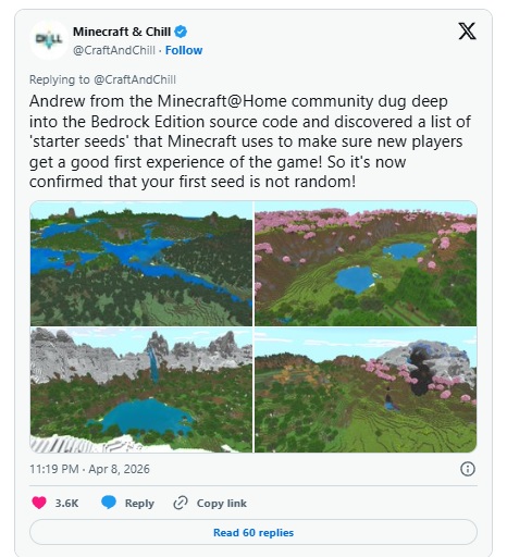 Согласно информации, раскрытой Эндрю, в исходном коде Bedrock Edition есть список «стартовых сидов», которые Minecraft использует, чтобы обеспечить игрокам хороший первый игровой опыт. Это касается самого первого мира или самой первой игры, в которую игроки заходят в Bedrock, предлагая новым игрокам относительно приятный старт. Это также подтвердил популярный эксперт по поиску сидов @Jereaux.
