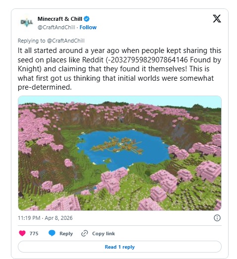 Всё началось около года назад, когда люди продолжали делиться этим сидом на площадках вроде Reddit (-2032795982907864146, найден Knight) и утверждали, что нашли его сами! Именно это впервые навело нас на мысль, что начальные миры в какой-то степени заранее предопределены.