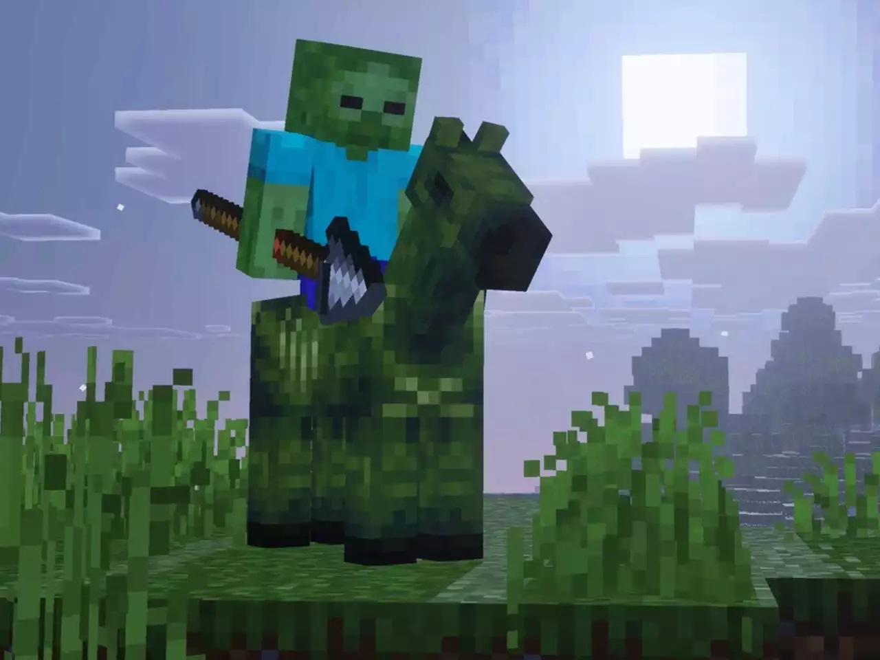 Кроме наутилуса, наконец-то появятся и зомби-лошади в режиме выживания. В творческом режиме их можно призывать с 2013 года, но в игру они так и не попадали. Теперь их можно будет встретить в саваннах и равнинах. Как и обычные лошади, сами по себе они пассивные, но вот всадники, которые будут на них появляться, — нет. Если убить всадника, лошадь можно приручить. Однако, как и обычные зомби, такие лошади горят на солнце, поэтому использовать их получится только ночью.