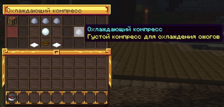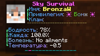 Также тут Вы найдете информацию о Вашей жажде и температуре. Помните, что Вы можете либо замерзнуть в холодные ночи или биомах или сгореть на солнце, получив ожоги